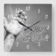 O relógio de parede com símbolo de amor, esperança, paz e graça em preto e branco. Jesus foi crucificado para salvar aqueles que acreditam e seguem a palavra de Deus. O sol brilha através do buraco em suas mãos nos lembrando, que ele é a luz e o caminho. John 8:12 "Então, Jesus voltou a falar com eles, dizendo, eu sou a luz do mundo: aquele que me segue não caminhará na escuridão, mas terá a luz da vida."
