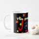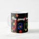 Se o seu nome é James, reivindique a sua posse desta caneca brilhante e colorida com o seu nome em letras de colagem de papel pintadas à mão, num fundo preto, aspergido com estrelas amarelas, laranja e vermelhas. As palavras "Esta caneca pertence a..." estão escritas em branco logo abaixo da borda.