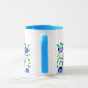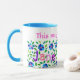 Uma caneca branca, com jante azul em pó e alça, decorada com uma colagem de papel pintada a mão floral e as palavras 'This Mug Pertence a Jane'. Lavadora de louça e micro-ondas seguras.