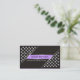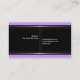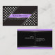 Pernos metálicos prateados e faixas diagonais cartões de visitas roxas pretas, com dois triângulos cobertos com pernos metálicos em dois cantos do cartão, faixas diagonais de prata e uma banda roxa lavanda no centro com seu nome. Fundo preto.