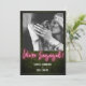 Anúncio de noivado com letreiro neon rosa inspirado em "estamos noivos!" sobre fundo de verde boxwood com foto e texto branco.