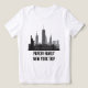 Personalize estas camisas femininas de Nova Iorque chic para a sua viagem familiar à grande maçã. Apresenta um desenho excelente preto e branco do horizonte de Manhattan e da Estátua da Liberdade acima do seu texto personalizado. Legal presente de arranha-céus para sua viagem.