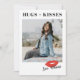 Perfeito para um namorado, marido ou amante, esta placa de Dia de os namorados inspirada em Polaroides apresenta uma grande foto com uma camada de ilustração de beijo desenhada à mão. A saudação "Hugs + Kisses" é colocada de forma destacada na parte superior do cartão, em uma fonte em negrito, enquanto uma fonte moderna e cursiva é usada para o nome do cliente abaixo. Um padrão de beijo de coordenação é apresentado na parte traseira da placa.