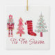 Um "Esta é a estação" que diz o ornamento da árvore de Natal com símbolos amados dos feriados de Natal em cor-de-água rosa e vermelha. Árvore de Natal, biscoito de Natal, soldado de brinquedo maluco, estocagem de Natal. Algumas das suas coisas favoritas.