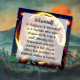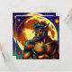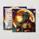 Uma representação de um lobisomem em frente à lua de cheio com olhos brilhantes. Esta arte ai é feita em quadrinhos com desenho de pop de arte hiper realista. O verso do cartão dá uma definição de lobisomem.