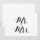 Simples e elegante sinal de casamento do estilo caligrafia preto e branco "Sr. e Sra.". Este cartaz de casamento "Sr. e Sra." parece excelente impresso em um papel mate, se você precisar de algo mais tradicional, use o Laid, Linen ou Columned, para um toque rústico usar o Artisan Kraft, se você quiser adicionar um toque de vidro, use o Luxe. Este é um sinal de cartão impresso plano de 5" x 7", que ficará muito elegante em uma imagem.