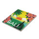 Bali Indonésia azulejo com uma ilustração de colagem original, modelada após os posters no estilo viagens vintage do passado. A imagem tropical de cor brilhante inclui um pôr do sol sobre o oceano, uma palmeira estilizada, flores de frangipani e uma silhueta de um templo balinês.