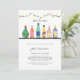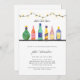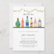 Os convites de chá de casamento de estoque apresentam licor de aquarela e garrafas de vinho em uma prateleira com luzes de cordas suspensas acima. (Arte original de Shelley Winters Design)