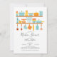Faça o estoque moderno do chá de panela da cozinha, com ferramentas da cozinha azul e laranja, sobre um fundo branco contemporâneo, com um fundo azul de coordenação. Visite o nosso compro para ver os convites de chás da cozinha correspondentes.