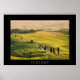 Na moda poster de impressão de uma paisagem na Toscana com a famosa estrada de Bianca (estrada branca/estrada suja) Gladiator Road em direção a Terrapille, com ciprestes ao longo da madrugada perto de Pienza, no Vale de Val d'Orcia, em Itália, com uma fronteira negra, e o texto: "Toscana". Excelente decoração de verão na sua parede!
