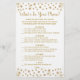 Estes elegantes "What's In Your Purse Cards" são uma forma excelente de se divertir com o seu Chá de fraldas e é garantido ser um grande sucesso! Simplesmente passá-los durante o Chá de fraldas, onde os convidados se divertirão a passar pelos seus telefones celulares e a verificar os itens que têm na lista. A pessoa com mais pontos ganha! O design apresenta estrelas douradas falsas. O ouro e as cores brancas são perfeitos para chás de fraldas neutros do gênero.