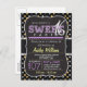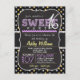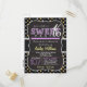 Cute Sweet 16, 16, convite para estrelas amarelas, pretas e cinzas, padrão noturno estrelado com elementos de design ric roxo. 16, 16 festas de aniversário convidam para garotas. Vintage sente fontes de giz roxas e amarelas em fundo legal de quadro negro.