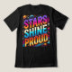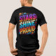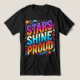 A design de camiseta "Stars Shine Proud" apresenta um céu noturno vibrante cheio de estrelas brilhantes, simbolizando esperança, unidade e brilhantismo. No centro, uma estrela maior irradia luz, representando orgulho e individualidade. As estrelas circundantes formam constelações sutis, criando um sentido de união e de empoderamento. A paleta colorida combina azuis profundos da meia-noite com dourados e silenciosos brilhantes, evocando uma atmosfera celestial. O olhar geral é inspirador e visualmente impressionante, perfeito para aqueles que querem vestir seu orgulho e confiança com estilo.