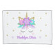 Este travesseiro apresenta um design de unicórnio roxo giro com flores, estrelas e brilho dourado falso. Personalize-o com um nome.