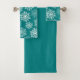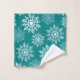 O conjunto de toalhas temidas de inverno mostra um padrão de estrelas de neve em um fundo de turquesa.