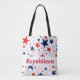Esta bolsa de tote de tamanho médio é mostrada com estrelas patrióticas impressão com texto republicano. Personalize este item ou comprar como está.