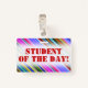 As características deste design do crachá uma mensagem customizável gostam do "ESTUDANTE DO DIA! ", junto com um teste padrão colorido das listras. Poderia talvez ser usado por professores para motivar, incentivar e recompensar os estudantes que fizeram um bom trabalho.