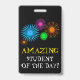As características deste design do crachá uma mensagem customizável gostam "de ESTUDANTE SURPREENDENTE DO DIA! ", junto com um teste padrão colorido que assemelha-se estourando fogos-de-artifício. Poderia talvez ser usado por professores para motivar, incentivar e recompensar os estudantes que fizeram um bom trabalho.