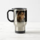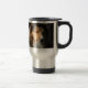 Fim acima de um estudo da cabeça do sheltie em uma caneca de viagem.