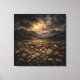A powerful and moody landscape featuring a field of wild orange and white flowers leading toward jagged, shadowed mountain peaks. The sky is filled with a heavy, textured impasto light that creates a dramatic, ethereal glow. Part of the "Storm and Spirit" collection, this 24x24 canvas captures the raw, untamed beauty of the natural world in a high-contrast, fine-art style.