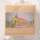 Um desenho a lápis de aquarela e pintura da Capela Alto Vista em Aruba com Mar Caribe e vários cactos, rochas e arbustos espinhosos.