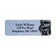 Apresentando uma imagem de um local elegante, essas etiquetas de endereço de temas azuis e pretos são realmente notáveis. Com um fundo azul, há uma imagem de local preto na borda direita do rótulo. O texto está escrito em preto.