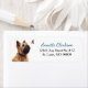On this cute return address label, an image of an adorable Cairn Terrier dog is fascinated by a flitting Monarch butterfly. Your custom text is in blue and black at the right of the image.