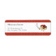 Etiquetas de endereço de retorno adoráveis em vermelho com bolinhas com ilustração de um pássaro pirata com seu patch, seu bandana e sua espada. Altere o texto para o seu. Ilustrada e projetada por Patricia Alvarez.