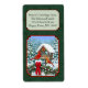 Um par de Cardinais Vermelhos Nortes tocam uma cerca branca de picete coberta de neve enfeitada com a garland de Natal e um arco vermelho brilhante. Eles banquetes em um alimentador de pássaros de inverno decorado com sinos de Natal, fita e Holly. Trabalho de arte realista criada pelo artista da vida selvagem Crista S. Forest.