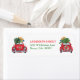 Um pequeno carro retrô vermelho é carregado com uma árvore de Natal e pacotes de presentes nesta bonita etiqueta de endereço de retorno. Do lado esquerdo, o carro está vindo em direção ao espectador, e do lado direito ele está indo embora. Seu texto personalizado está vermelho e verde no centro. Bonita!