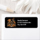 Etiquetas de endereço com uma ilustração legal e assustadora de uma casa assombrada de madeira. Cercados por grandes abóboras laranja e árvores com folhas laranja. Janelas com luzes laranja adicionam um brilho agradável. Design de Halloween divertido.