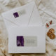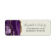A borda esquerda desta elegante e moderna etiqueta de endereço de retorno de convite de casamento apresenta uma cor d'água púrpura e borda agitada com falso brilho dourado. O texto personalizável combina a escrita manual de cinzas de carvão e fontes de impressão em um fundo de marfim.