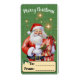 Uma etiqueta verde de presente de Natal, com um Santa Clause feliz, segurando uma pilha de presentes vermelhos. Dotado com estrelas brilhantes quentes.