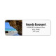 Etiquetas de endereço com uma fotografia de natureza cênica. Belo mar azul de turquesa com uma praia arenosa. Uma rocha marrom grande fornece sombra do céu azul brilhante.