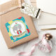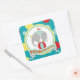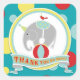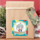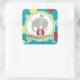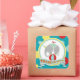 Vestido colante do tema circo com bolinhas brilhantes e um elefante com chapéu de aniversário balançando numa bola e um pássaro vermelho com chapéu de aniversário.