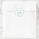 Estas belas etiquetas são perfeitas para agradecer aos convidados no chá de panela da noiva. O design apresenta um texto de caligrafia sofisticada em azul-turquesa sobre um fundo branco clássico com uma borda de renda floral prateada em foil falso. O texto diz Obrigada, com espaço para o nome da futura noiva e a data.