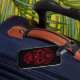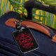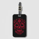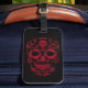 Esta é uma imagem de um crânio vermelho com fundo preto em uma etiqueta de bagagem