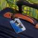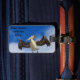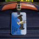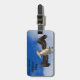 Um pelicano com asas largas, etiqueta de bagagem que você pode personalizar com seu nome e endereço em ambos os lados, se quiser.