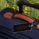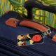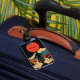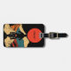 Stylized illustration of a motorcyclist riding toward distant mountains under a bold red sun. The vivid colors and minimalist lines create a sense of freedom and exploration, making this design an ideal choice for a luggage tag that reflects adventure and travel spirit.
