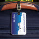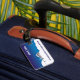 Uma etiqueta de bagagem mostrando um avião nas nuvens com céu azul.
