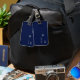 Imagem de um pequeno avião branco sobre fundo azul escuro, personalizado com o nome do cheio e as iniciais do viajante na moda.