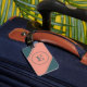Esta etiqueta de bagagem cônica apresenta um círculo geométrico duplo centrado em teal sobre um fundo de salmão pálido. Personalize o campo de texto com uma letra inicial ou clique em personalizar para selecionar uma cor de tipo, tamanho e estilo preferidos.