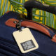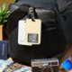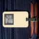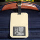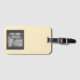 The Luggage Tag features a calm, sand-like design in warm beige and natural tones, reminiscent of fine beach or desert sand. A subtle artistic illustration is printed: a young woman sitting cross-legged in a classic yoga pose.