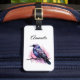 Uma etiqueta de bagagem com a imagem de um corvo preto com asas roxas cor-de-rosa. Uma água cor-de-rosa por trás deste adorável pássaro místico.
