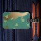 Uma pintura de fundo dourado com alguns pequenos trevos verdes. O fundo é um ouro profundo com pinceladas macias. Os cobertores são verdes e suaves e estão espalhados pelo fundo. A pintura tem um design limpo e é pintada em cores pastéis.
