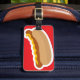 Uma ilustração estilizado de um cachorro quente com mostarda em um fundo vermelho.