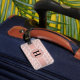 Acessorize sua bolsa de viagem com estilo com uma etiqueta de na moda e mala girada. Todo texto é simples de personalizar ou excluir, de modo que você pode incluir qualquer informação de contato que melhor se ajuste às suas preferências. Design apresenta um padrão em zig-zag de folha branca e falsa rosa dourada com faixa, e seu monograma personalizado com uma simples fonte de tipografia negra moderna. Este acessório elegante e moderno faz um presente chic para ela.