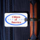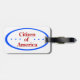 This luggage tag displays a badge stating "Citizen of America" with three blue stars on each side of the text and a blue rim around the edge.