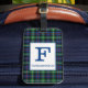 Etiqueta de bagagens com o tartan para Clan Farquharson, datada de 1774. Padrão tradicional de xadrez escocesa em azul brilhante e verde, com realces pretos, vermelhos e amarelos. Personalize com seu sobrenome e nome inicial em uma placa de cor clara para facilitar a legibilidade.