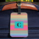 Uma etiqueta de bagagem acrílica com uma faixa horizontal colorido e uma inicial de solteiro monograma no centro. Este produto está disponível em dois estilos; padrão ou com slot de cartão de visita.